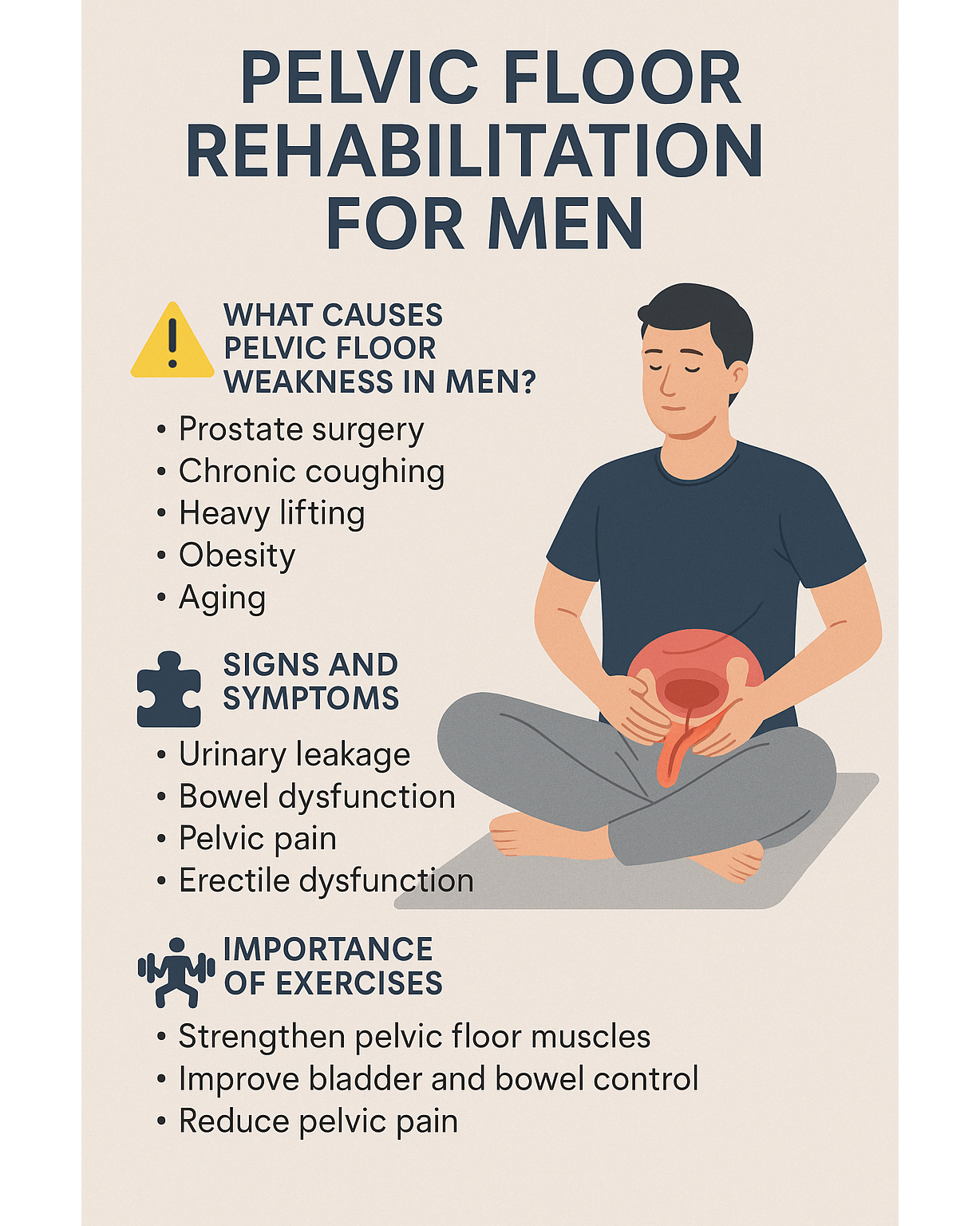 Male Pelvic floor Rehabilitation Yes, pelvic floor rehab is as important in male as its in female. Obesity, sedentary lifestyle, prolong sitting with no exercises, Heavy lifting, aging chronic coughing are few reasons for weakness in pelvic floor. This leads to Urinary leakage, Bowel dysfunction, Lowback pain, and Erectile dysfunctions. Osteopathy and physiotherapy play an important role in overcoming pelvic floor weakness. At chiropractor pune we have expertise in pelvic floor rehab.